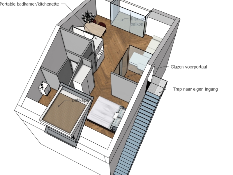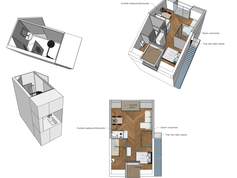 De verzelfstandiging binnen de woning ontstaat door het toevoegen van twee modulaire units: een badkamerunit en een kitchenette. Beide zijn compact, verplaatsbaar en voorbereid op plug-and-play aansluiting. We hebben een jongeren- en een seniorvariant voor de badkamer dan wel keuken.